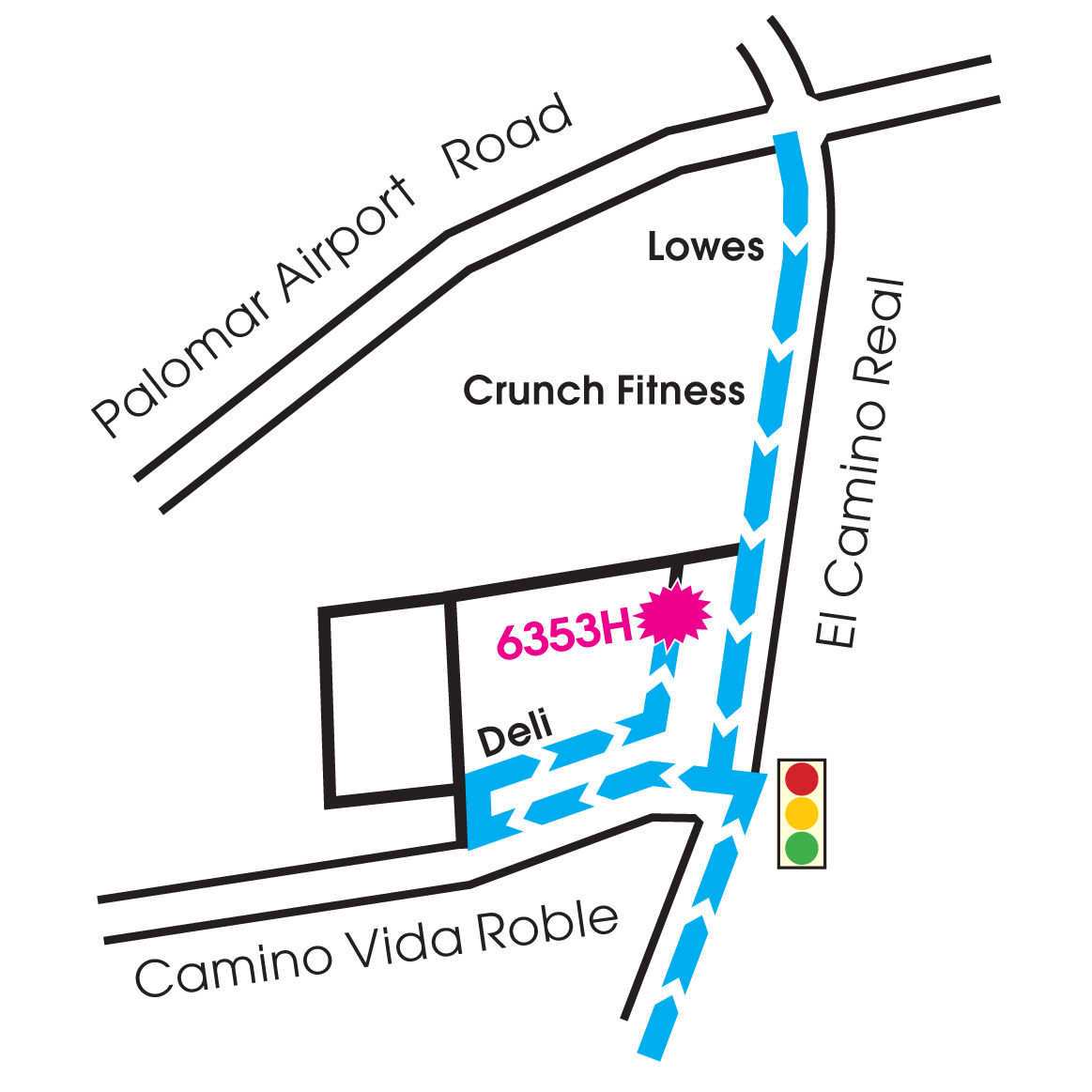 We are right at the intersection of El Camino Real and Camino Vida Roble - about one half a mile South of Palomar Airport Road on the West side of El Camino Real.